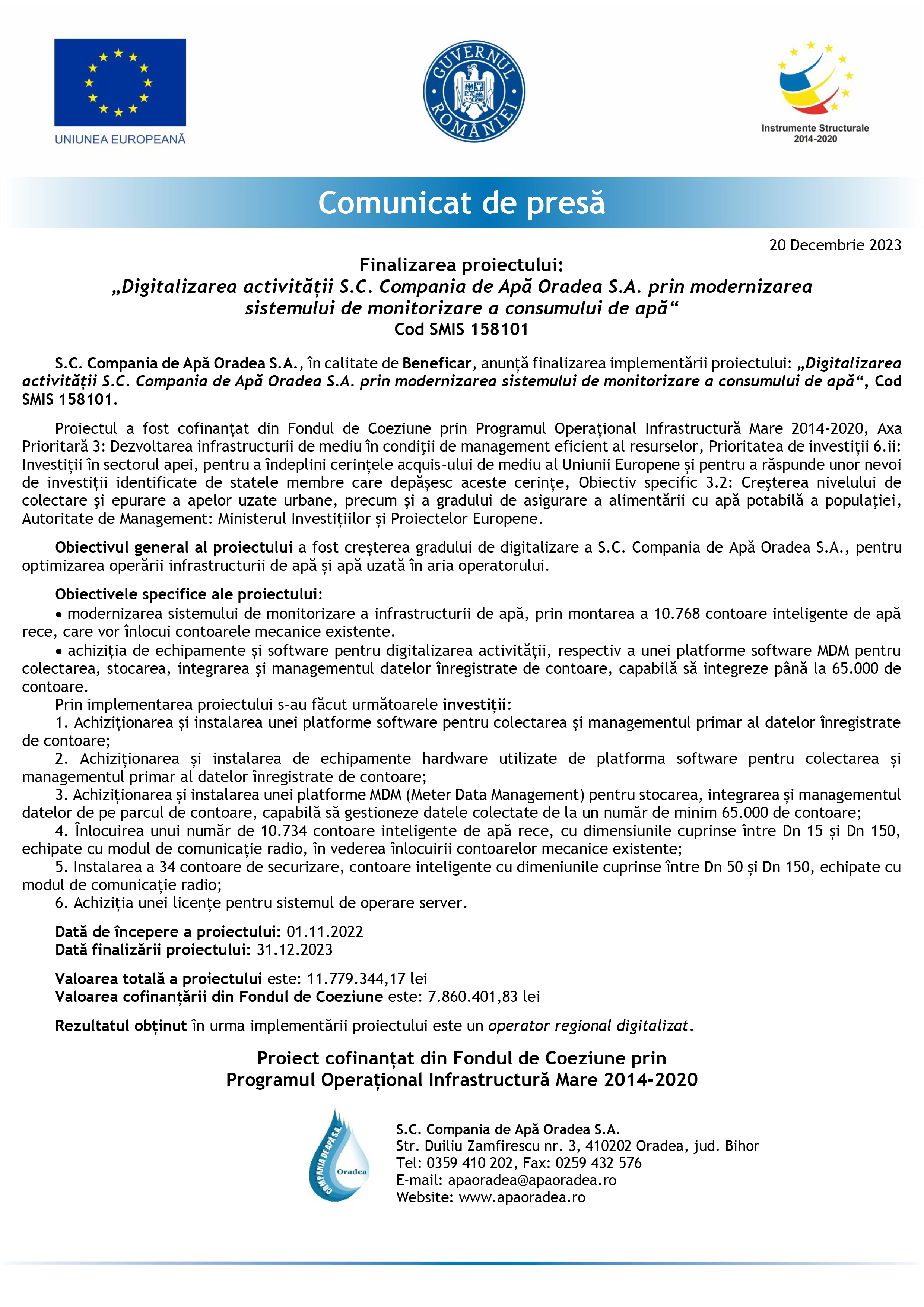 Compania de Apa Oradea anunta finalizarea proiectului „Digitalizarea activitatii SC Compania de Apa Oradea S.A. prin modernizarea sistemului de monitorizare a consumului de apa“ - SMIS 158101